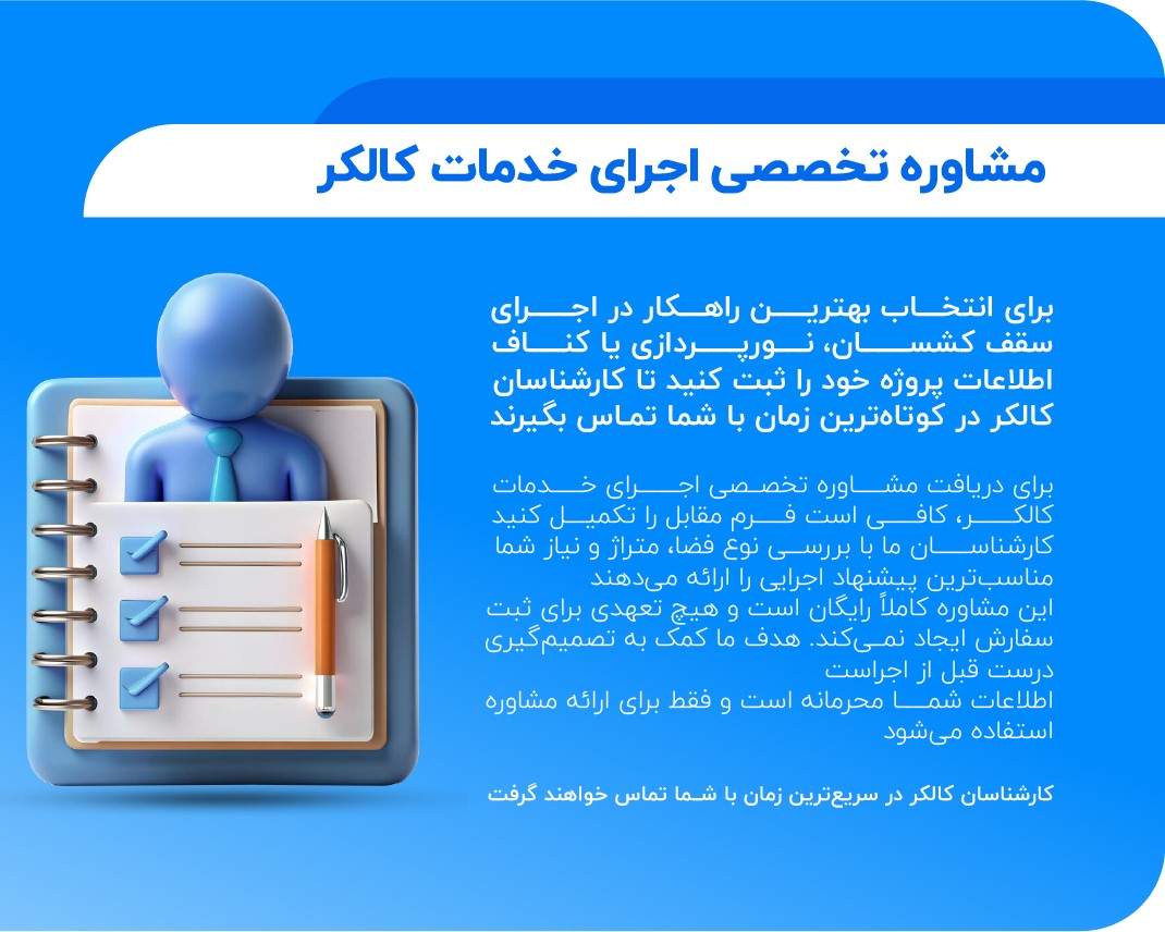 کالکر با تمرکز بر اجرا، کیفیت متریال و رعایت اصول فنی، خدمات تخصصی سقف کشسان و کناف را متناسب با نیاز هر فضا ارائه میدهد.